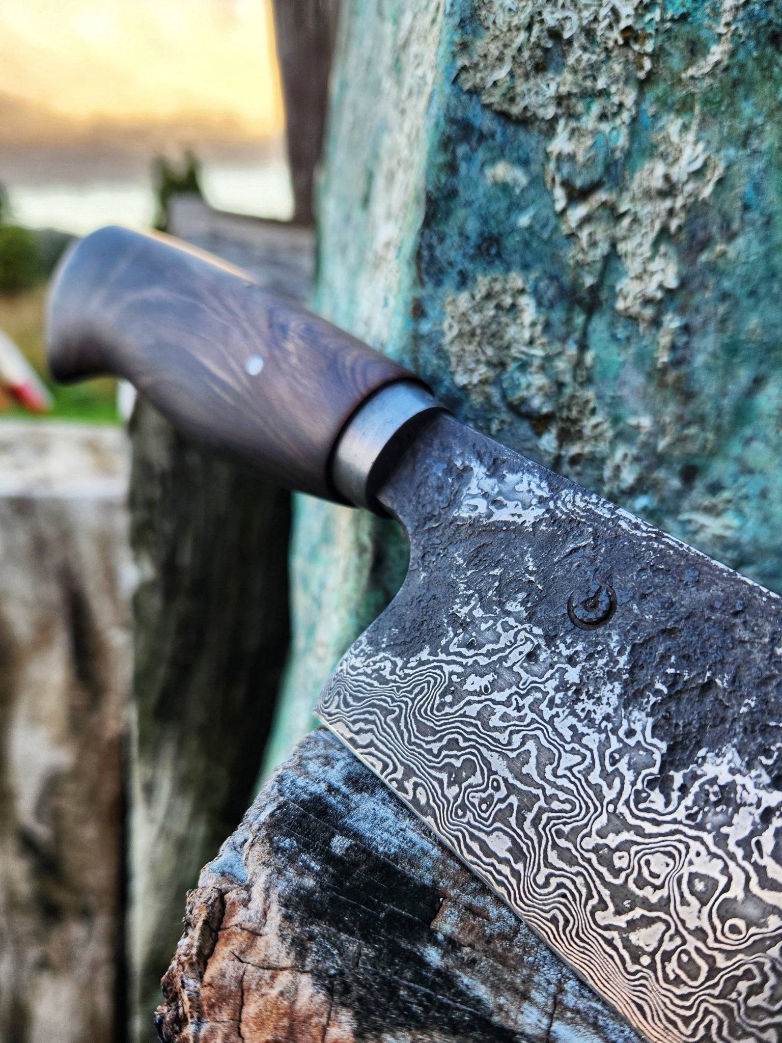Benjamin hand-forged the blade from layered 1084 and 15N20 Damascus carbon steel, delivering pattern contrast alongside edge retention, toughness, and sharpness for precise carving and BBQ tasks.