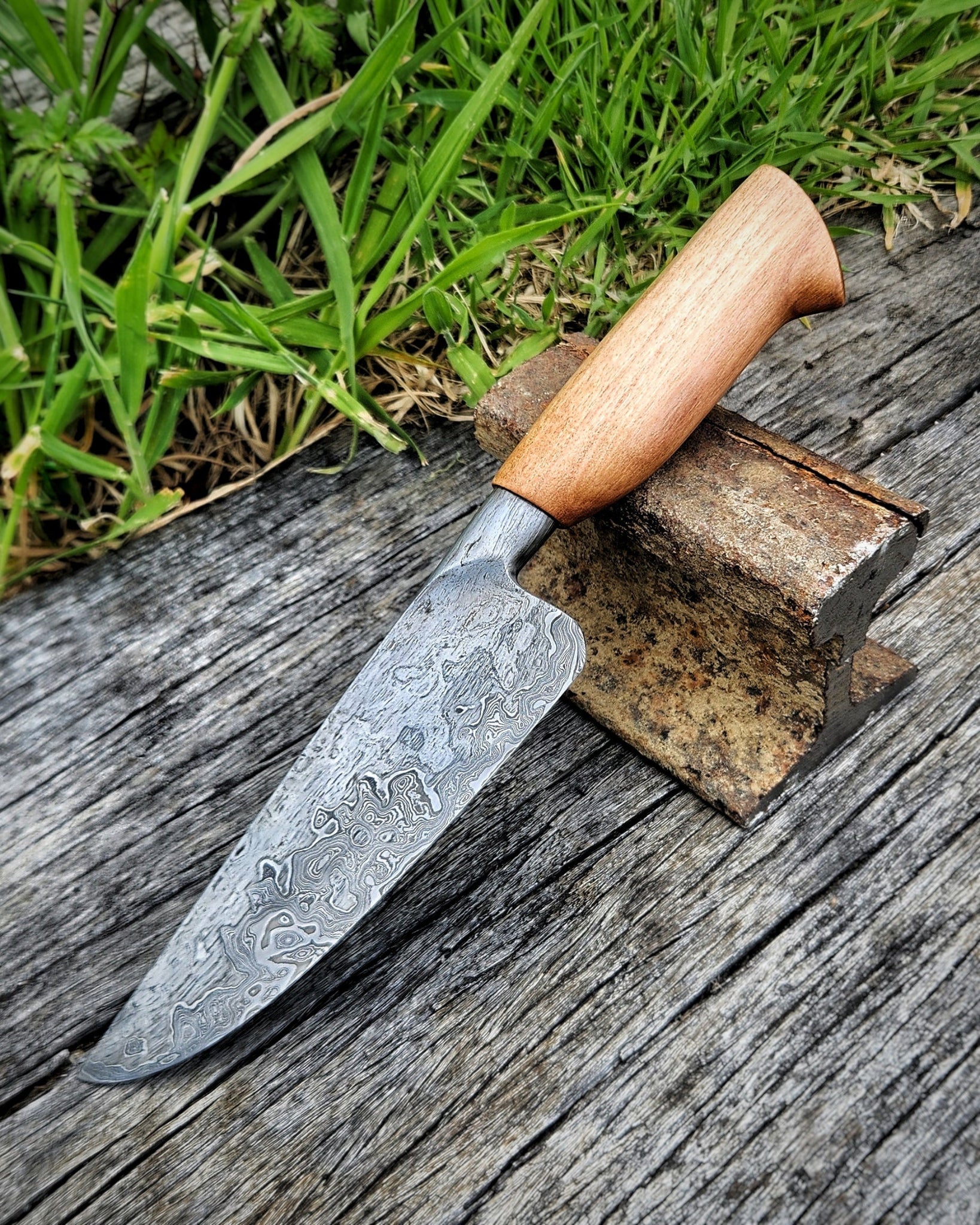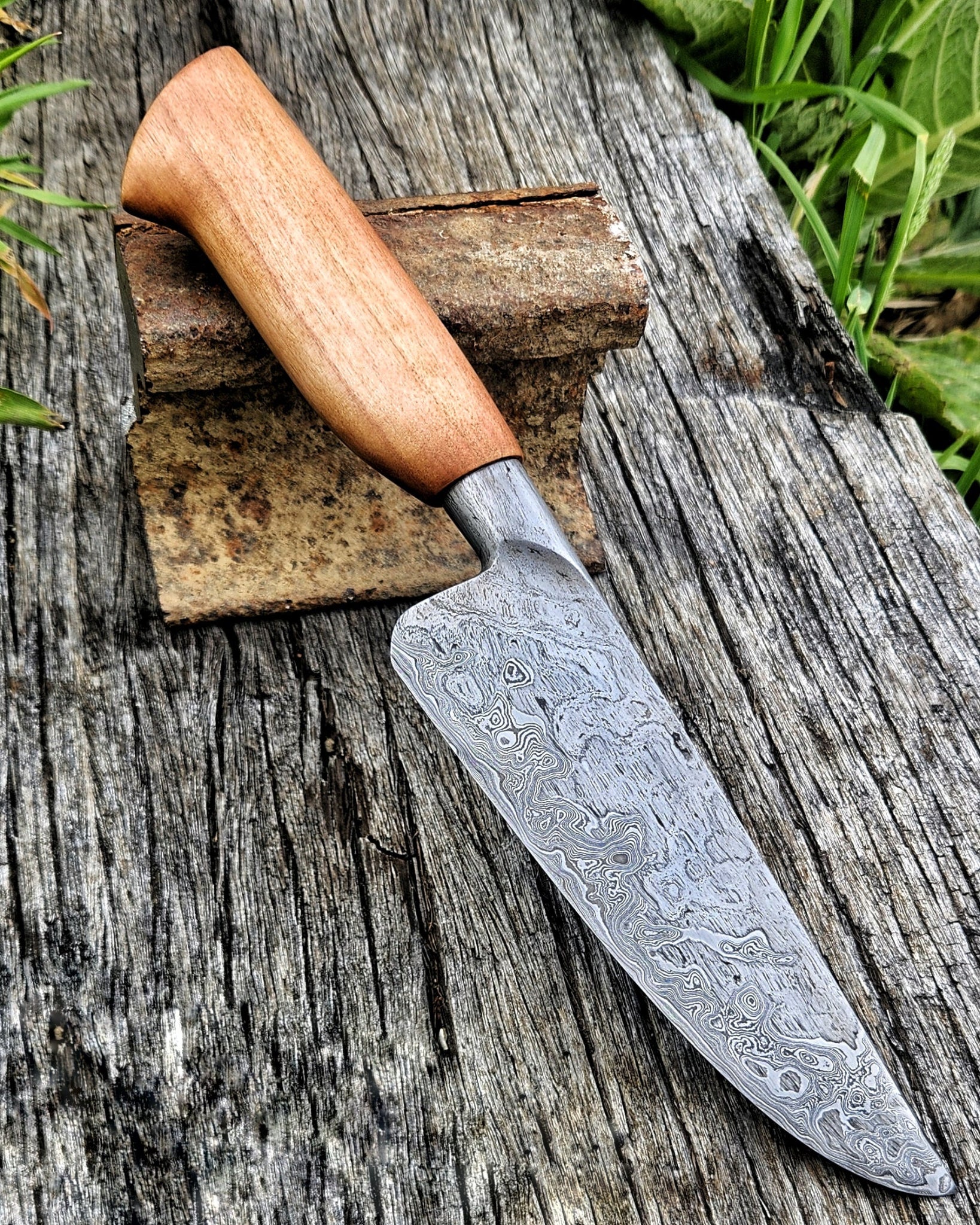 A local historian dates this wooden pile to Bridge 189’s original construction in 1879, part of the early Picton-Blenheim line that took root in the 1870s under Julius Vogel's visionary public works and immigration schemes. British wrought iron rail—imported to fuel the expansion and the thunder of the "iron horse"—clads 1084 and 15N20 Damascus steel, hand-forged into this one-of-a-kind heirloom integral chef's knife.