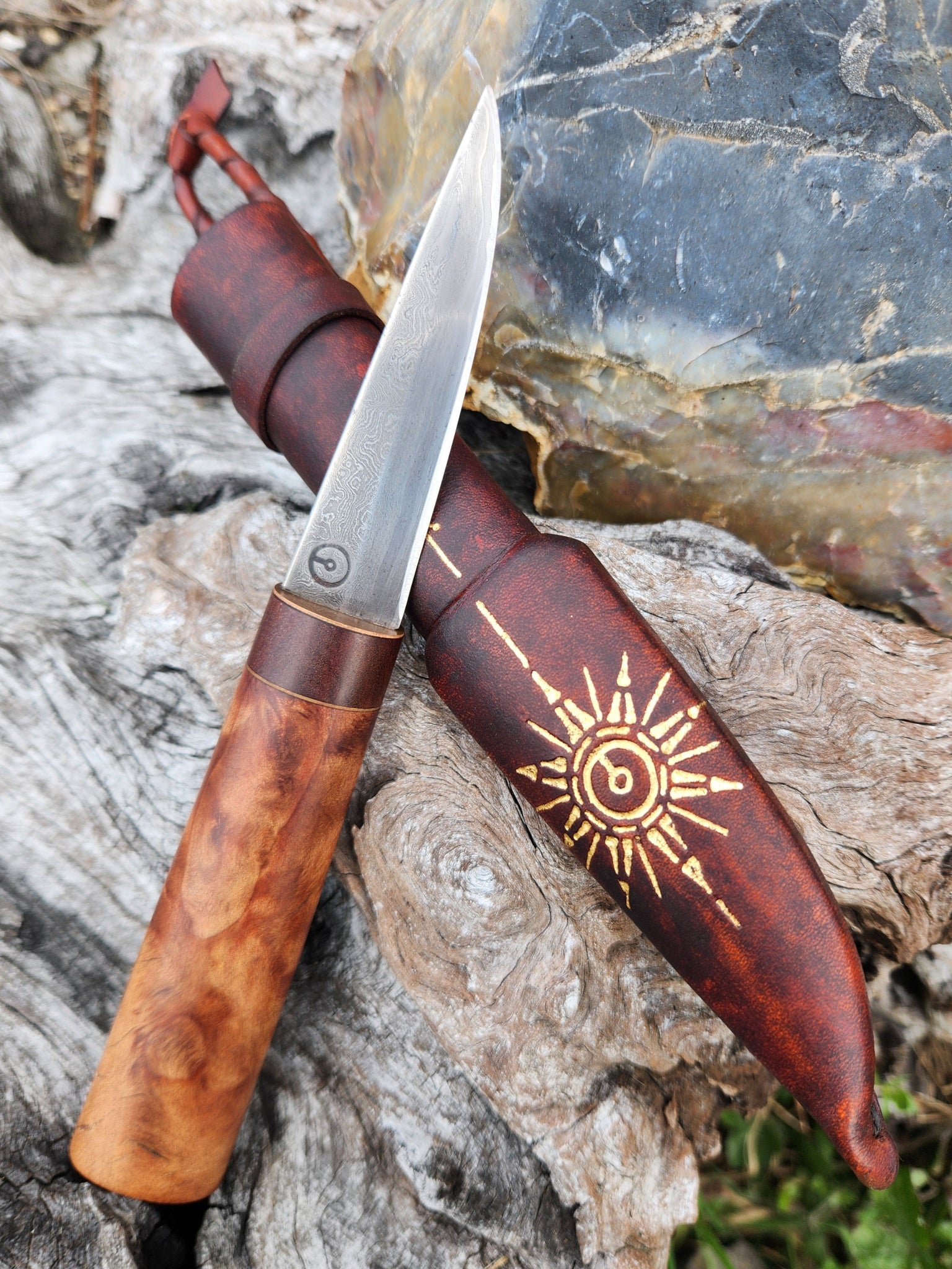 This truly one-of-a-kind piece is completed with a custom belt sheath handcrafted by Marisa from vegetable-tanned leather. Dyed a deep reddish-brown, it showcases a hand-embossed Northern Star motif elegantly accented with 24k gold leaf gilding for a refined, heirloom-quality finish.