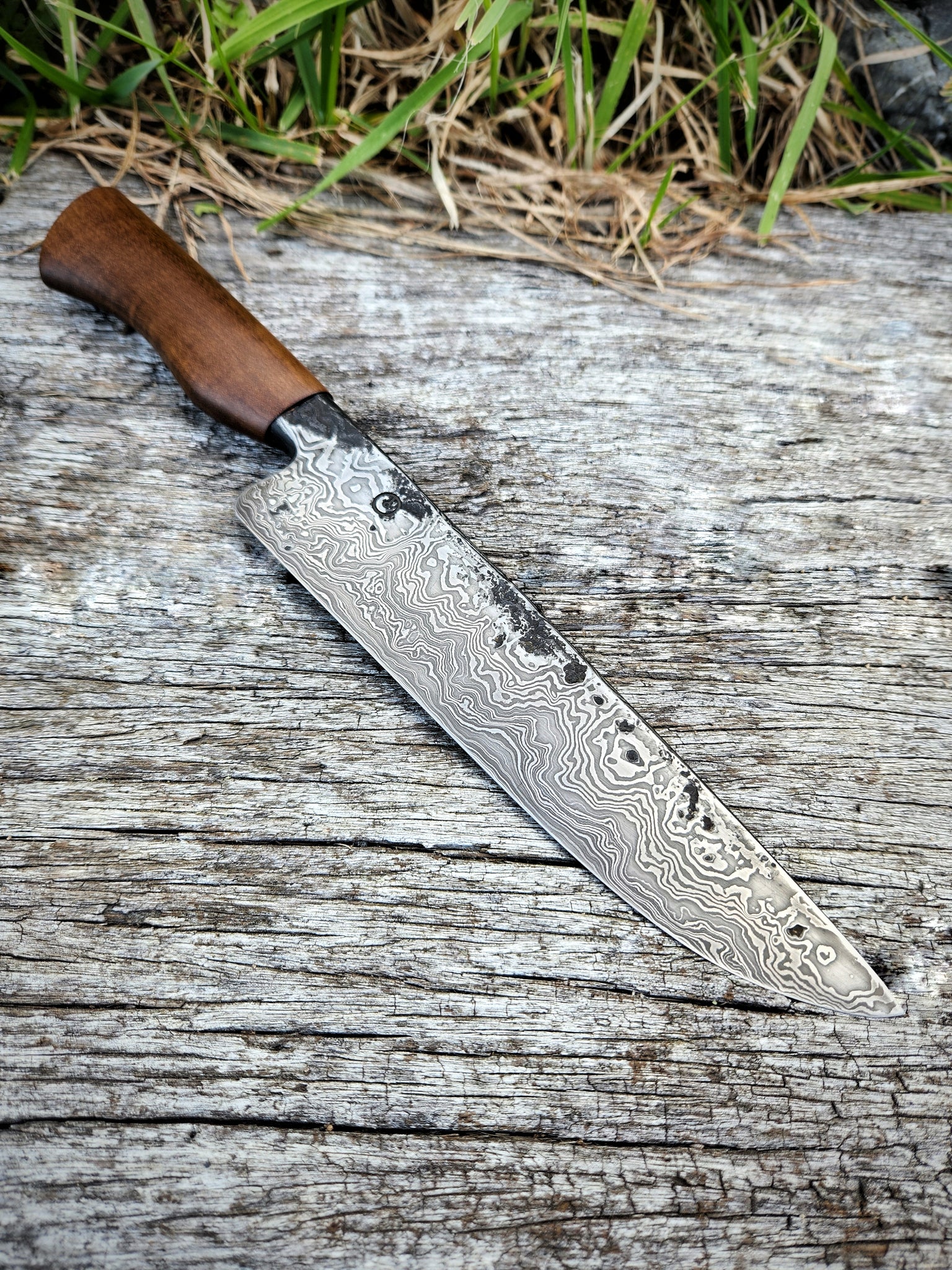 Benjamin hand-forged this striking chef knife using 1084 and 15N20 Damascus carbon steel, creating a blade with a distinctive layered pattern, good edge retention, and balanced performance for kitchen tasks.