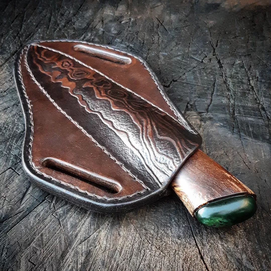 Marisa custom-made the ambidextrous pancake-style sheath in vegetable-tanned leather, hand-embossed to echo the damascus pattern on the blade.