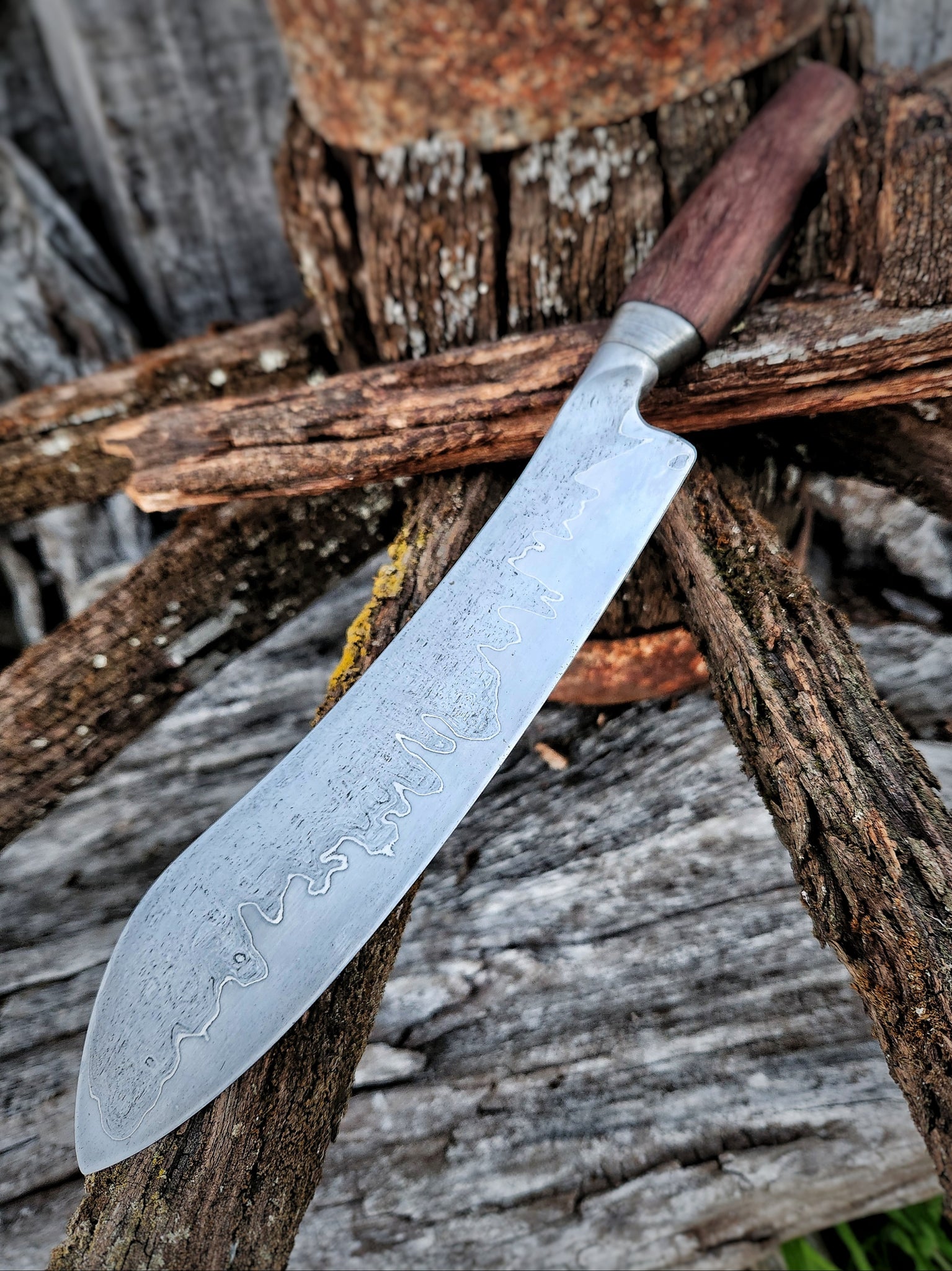 The handle, carved from a spoke of the same historic wagon wheel, delivers perfect balance and grip for heavy prep—history literally in hand, forged to become a generational heirloom. The custom display stand, shaped from another section of that weathered spoke, completes the transformation.