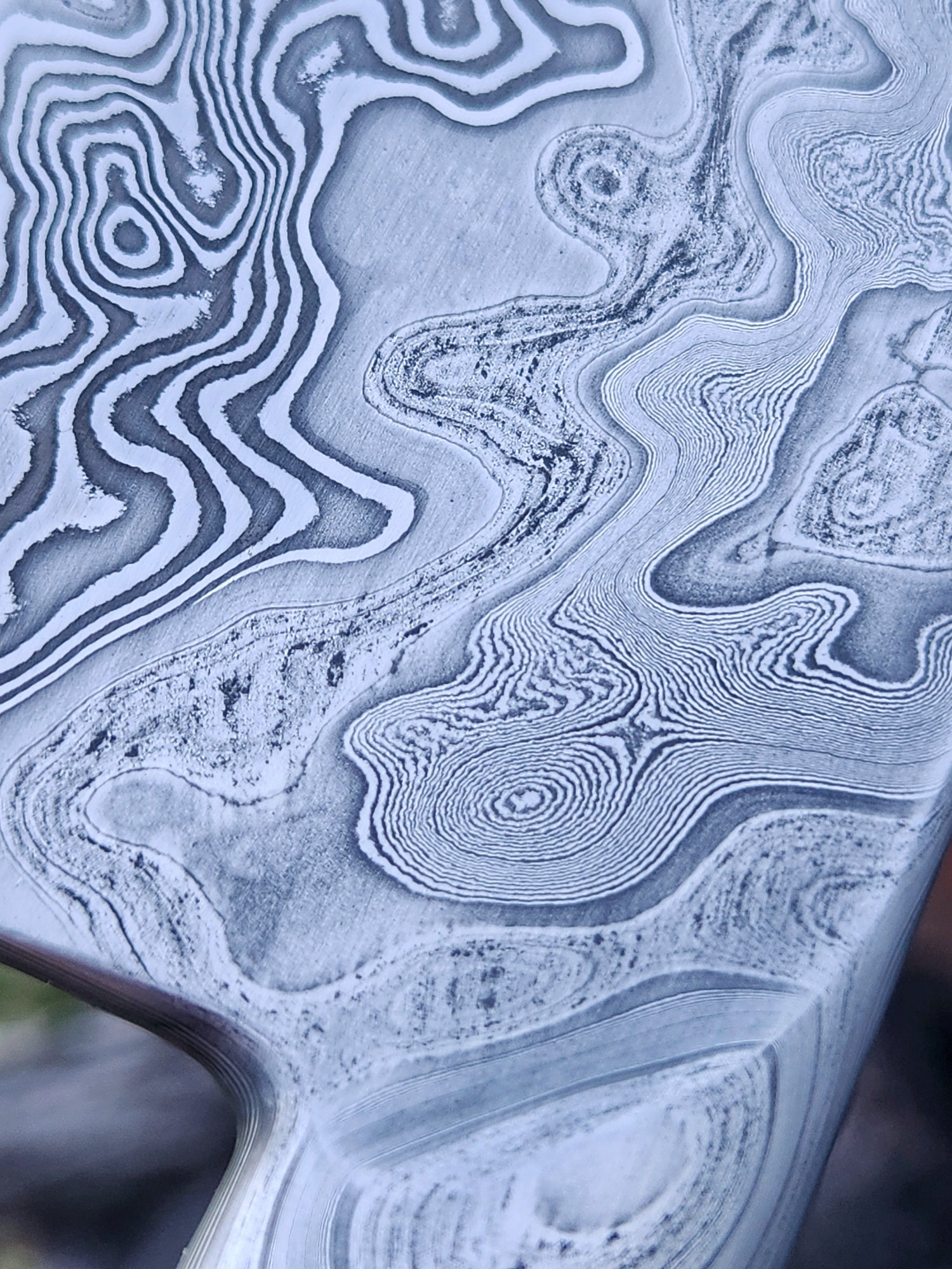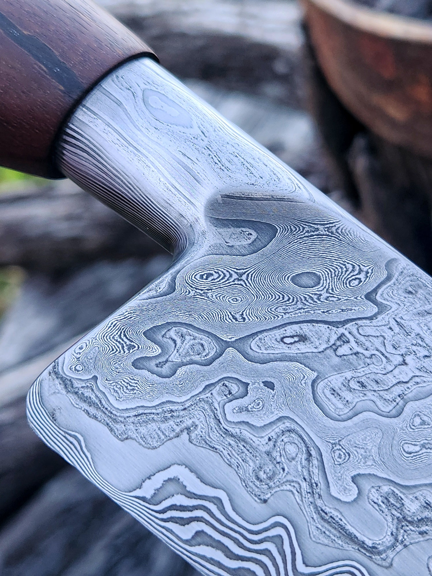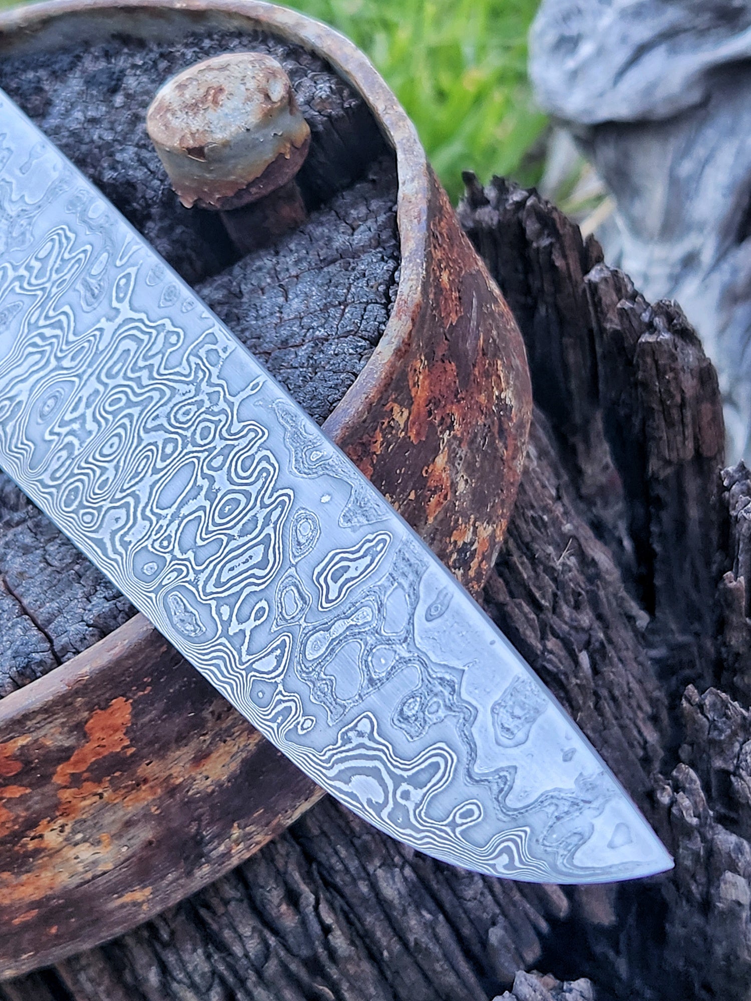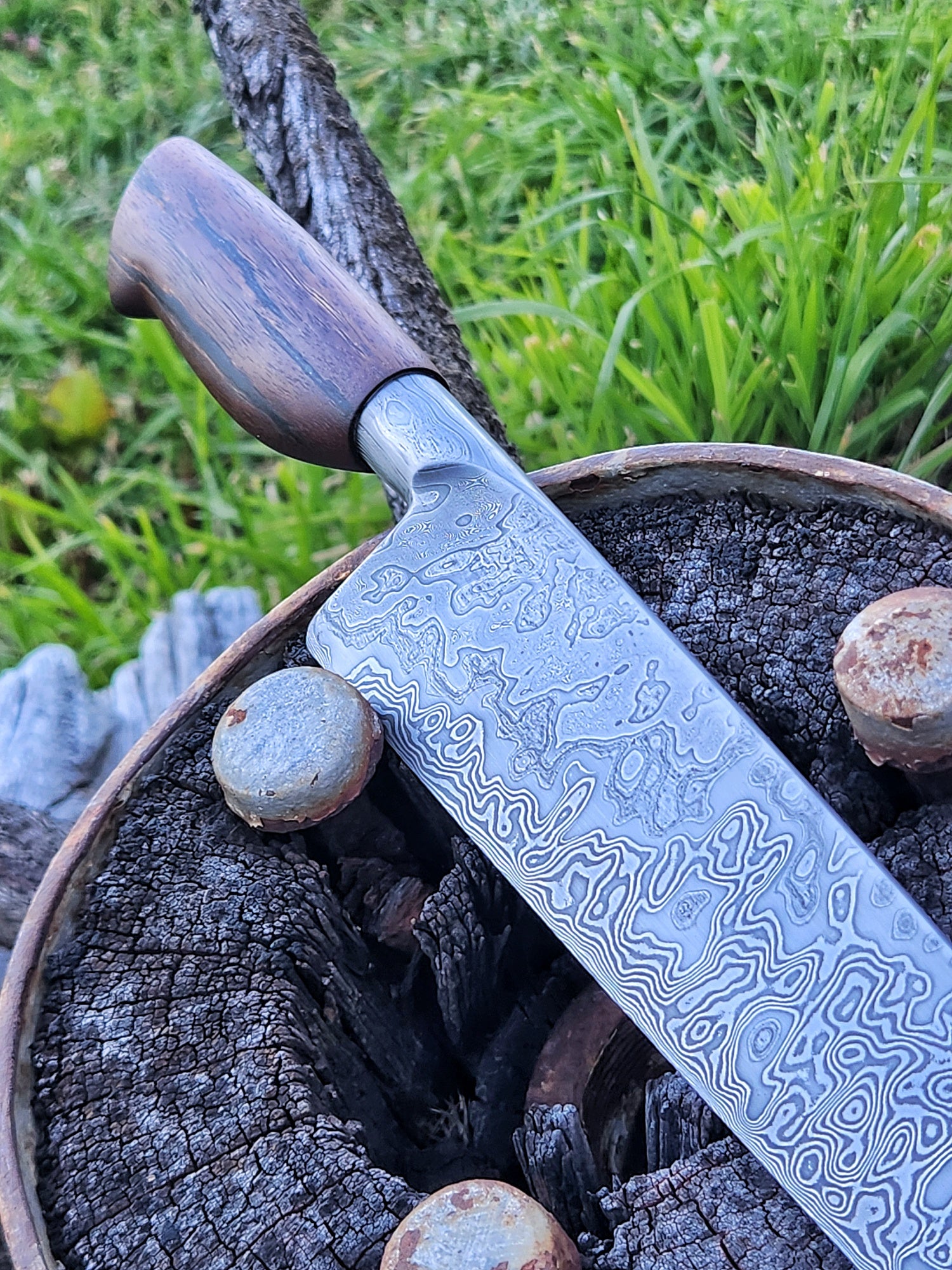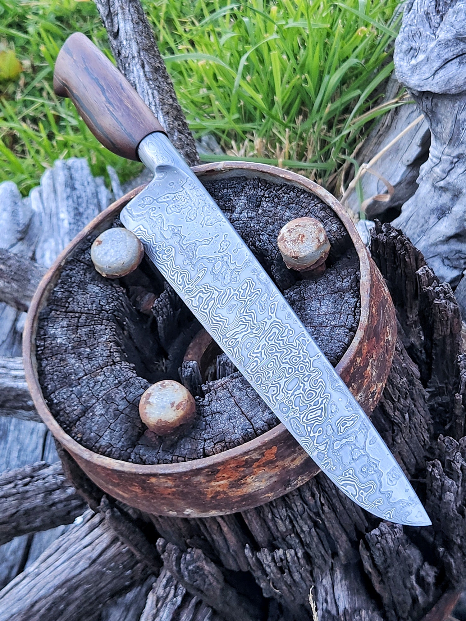 He hand-forged the blade from layered 1084 & 15N20 Damascus steel, enveloped in reclaimed wrought iron from a Victorian wagon wheel—its ancient fibrous veins etched to evoke the blacksmiths' enduring craft. The rich, polished hardwood handle and bespoke display stand are hewn from the very same time-worn wagon spoke, blending heritage with precision for today's culinary adventures.